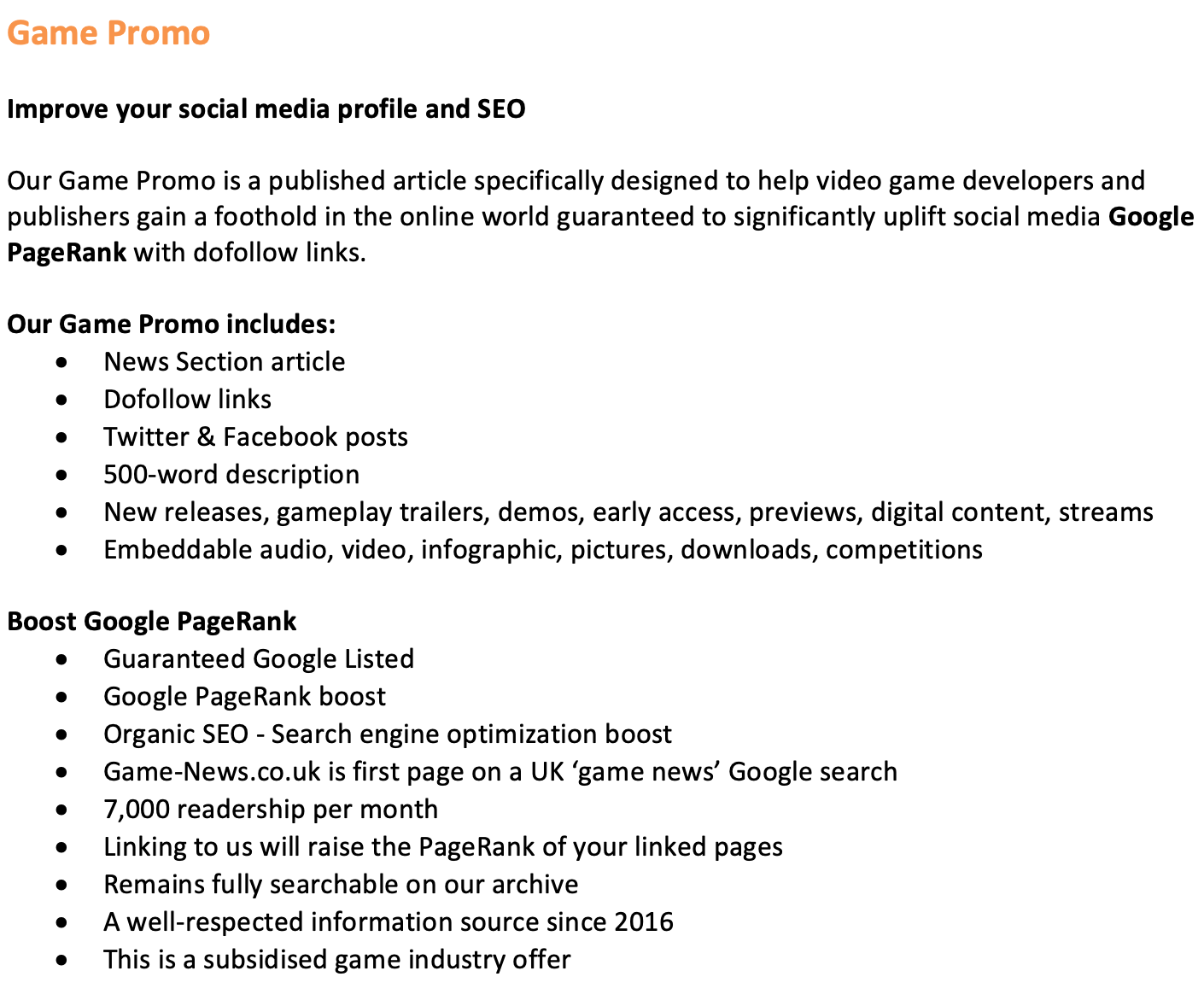 Promote new releases, news announcements. The Game Promo features all the benefits of our £750 - £1,250 Guest Post but heavily subsidised permitting repeat use.